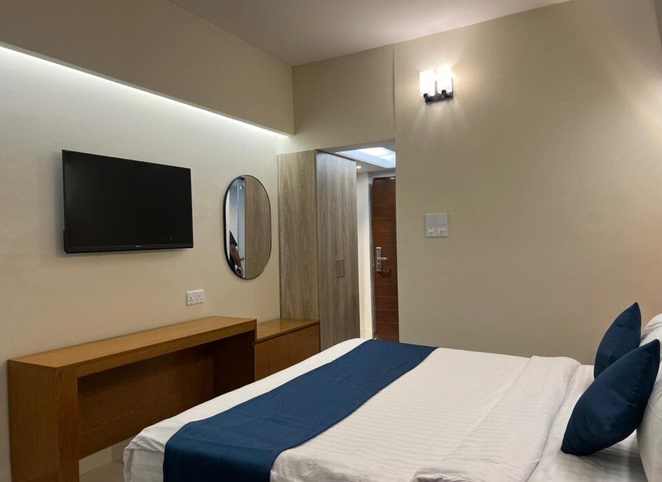 This opulent room boasts one king-size bed, adorned with exquisite interior design elements. Each bed is luxuriously appointed with fine linen, and the room features a comfortable sofa for lounging, complemented by two elegant plastic chairs. For your convenience, there’s a well-appointed working desk, a state-of-the-art RFID digital lock securing the main door, a digital safety locker, an LED TV for your entertainment, a telephone for easy communication, and a full range of custom-made bathroom amenities. With 24-hour room service and a host of other thoughtful touches, your stay promises unparalleled comfort and indulgence.