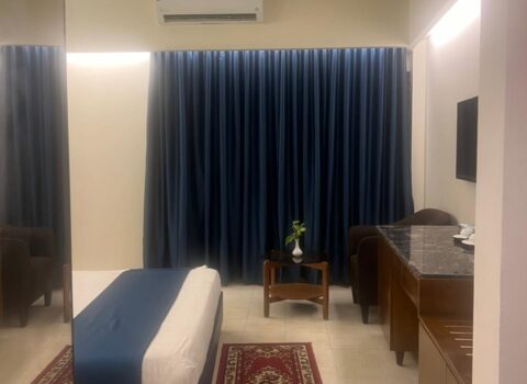 This opulent room boasts one king-size bed, adorned with exquisite interior design elements. This bed is luxuriously appointed with fine linen, and the room features a comfortable sofa for lounging, complemented by two elegant plastic chairs. For your convenience, there’s a well-appointed working desk, a state-of-the-art RFID digital lock securing the main door, a digital safety locker, an LED TV for your entertainment, a telephone for easy communication, and a full range of custom-made bathroom amenities. With 24-hour room service and a host of other thoughtful touches, your stay promises unparalleled comfort and indulgence.
